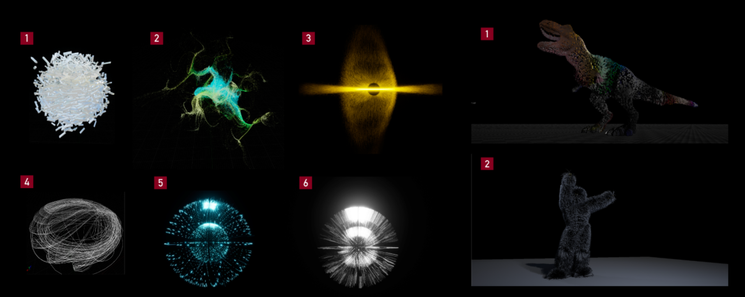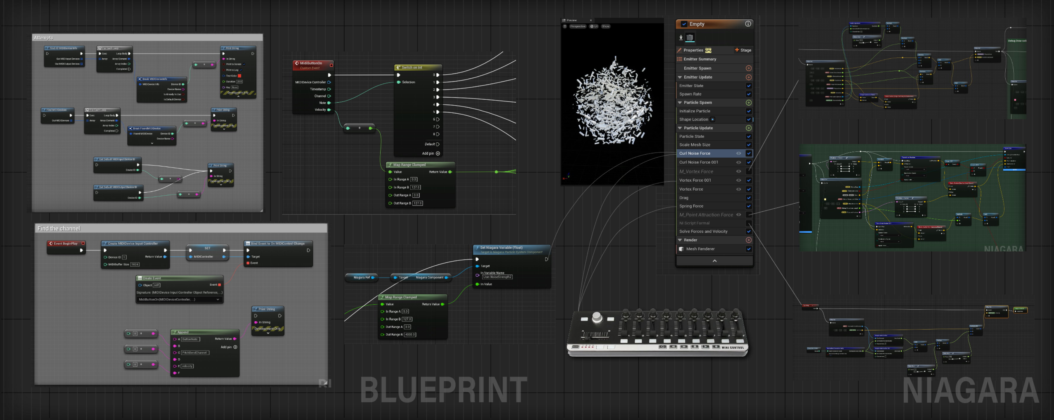 In UE, I created multiple particle systems that were dynamically controlled by various parameters. Force fields drove the particle systems, and their parameters were linked to MIDI sliders and music rhythms. This setup allowed me to build an interactive VJ system.