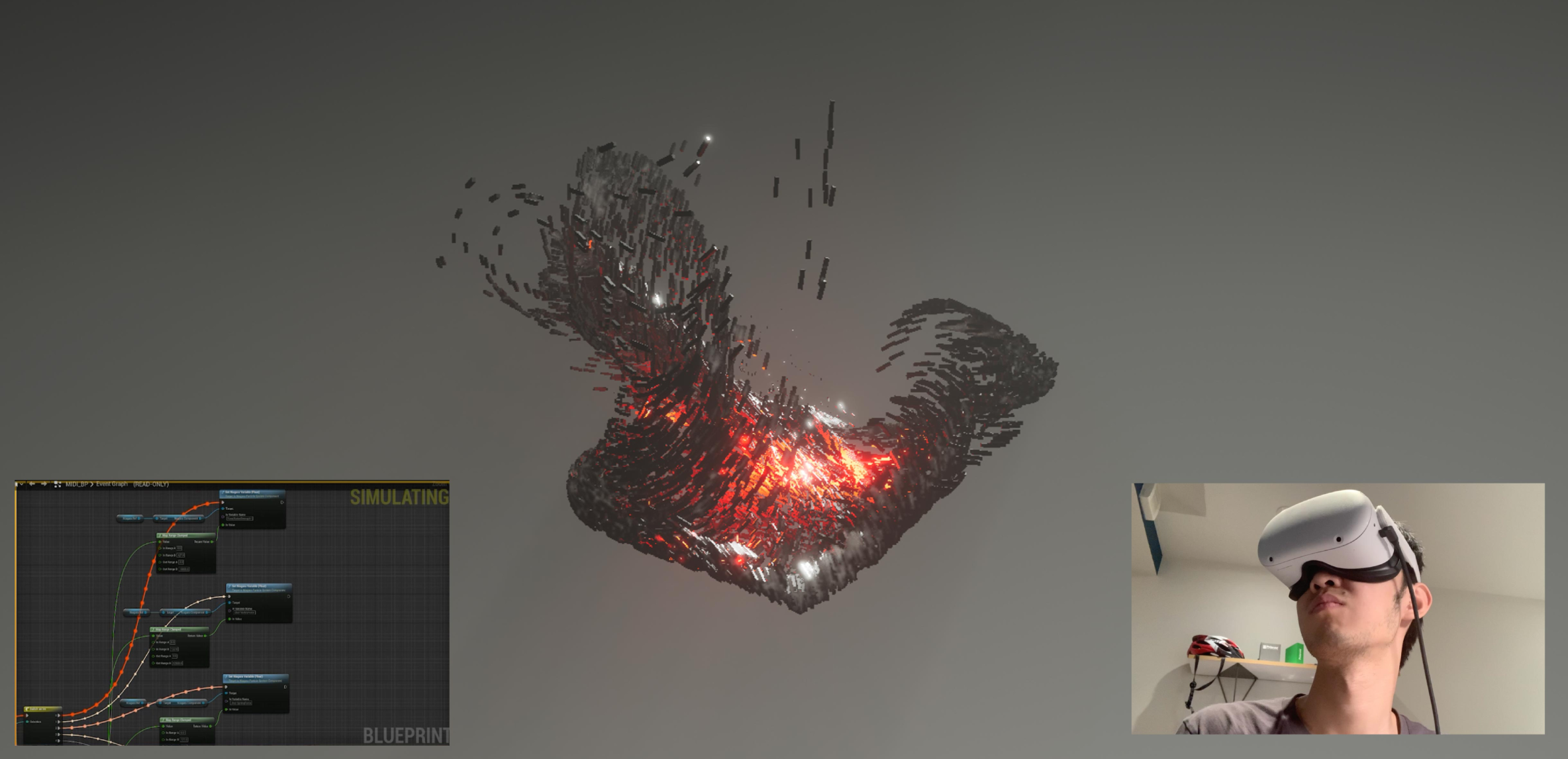 The idea came to me while experimenting with UE’s Niagara particle system and listening to music. I used an audio analyzer to break down the rhythm and linked different audio features to trigger specific visual effects. I connected these audio parameters to my MIDI controller and programmed Unreal to map key system controls to create dynamic visuals.