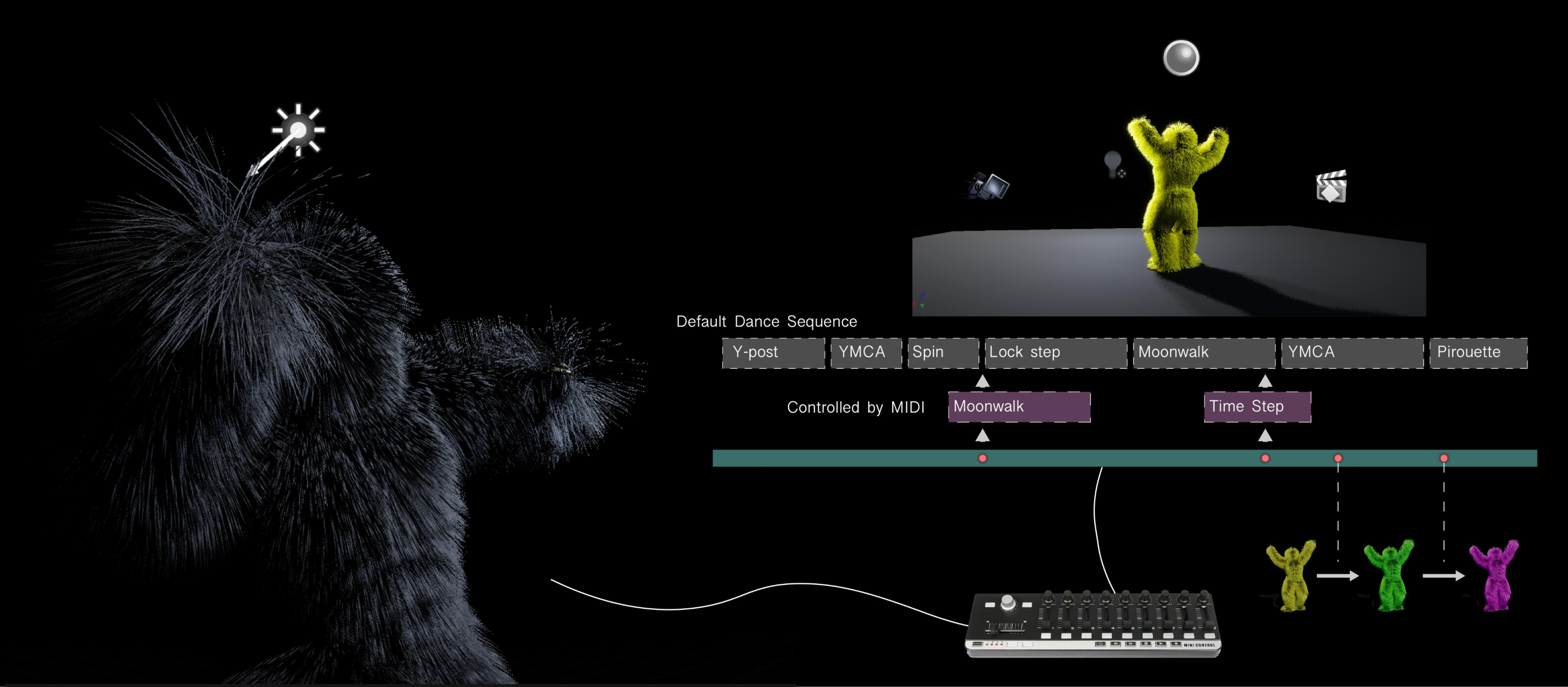 "There's a lot more potential with this concept. Using animation sequences, it’s possible to create real-time, interactive dance performances with virtual characters, where movements can be triggered by factors like rhythm and beats, or MIDI slides and buttons. For prototyping, I sculpted a furry character and created a default dance sequence. I used the motion blending feature in UE to combine different skeleton animations and generate new moves. If you have any suggestions or ideas, feel free to reach out!