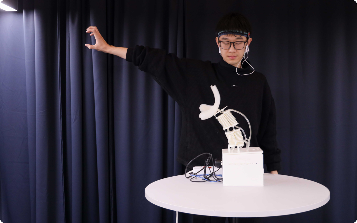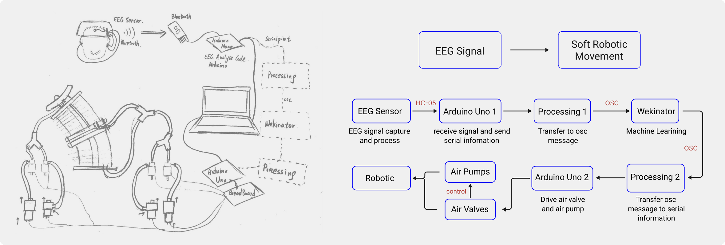 Our concept started with using EEG sensors to capture brainwaves and translate them into commands for controlling a soft robot with a pump system. The signals were transmitted through Arduino boards.
