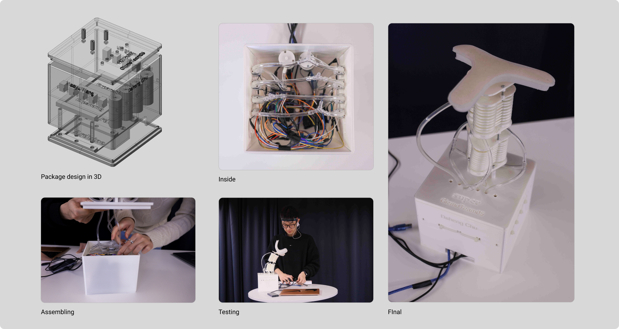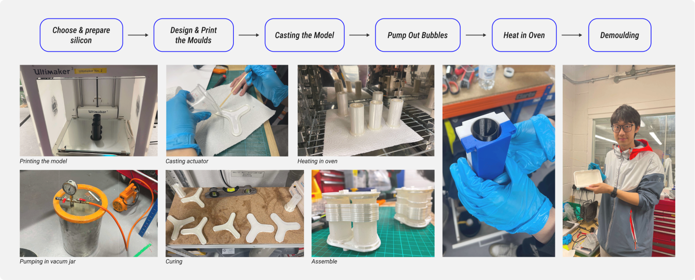 We built the soft robot system at the Morph Lab, Imperial College London, learning through many failures including poor air-tightness, uneven chambers, internal bubbles and more. This experience gave us valuable hands-on skills in building silicone systems.